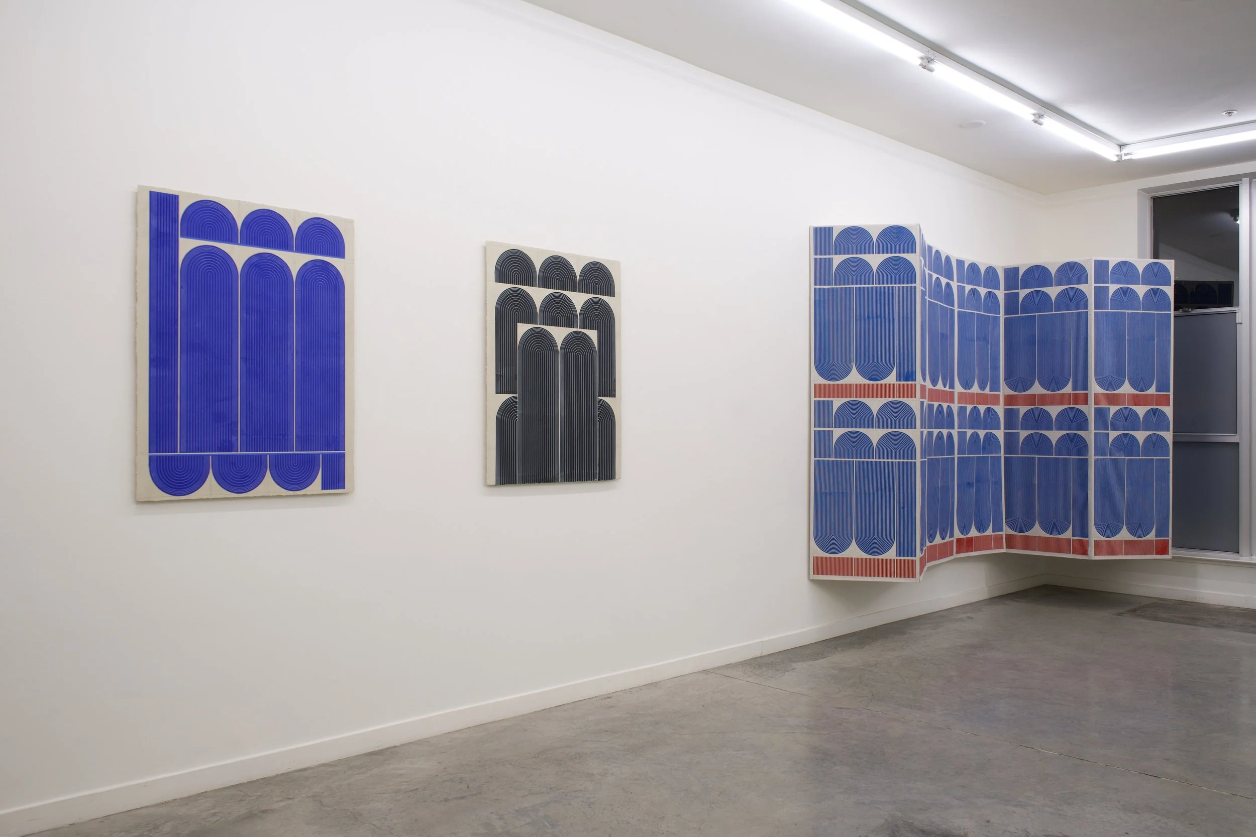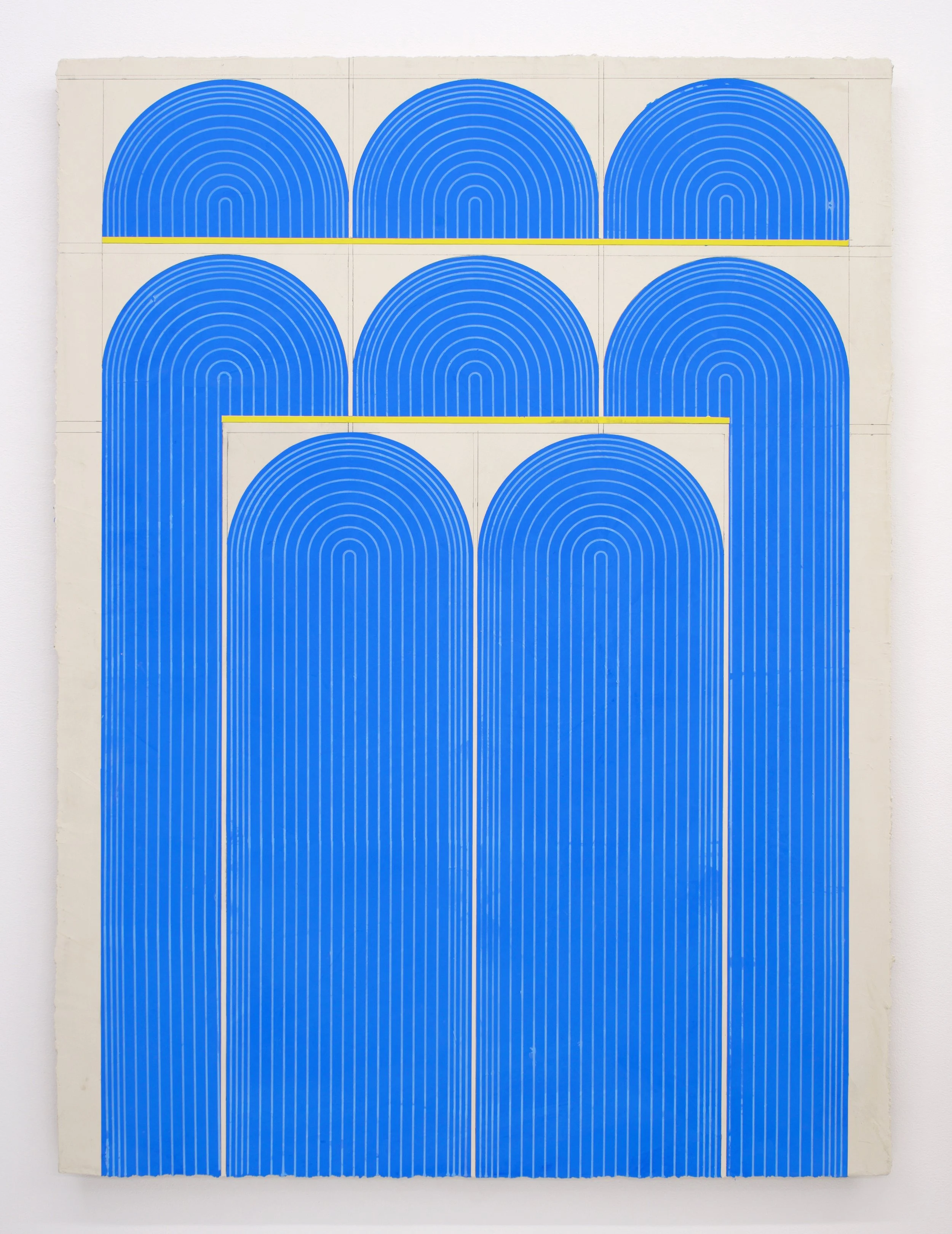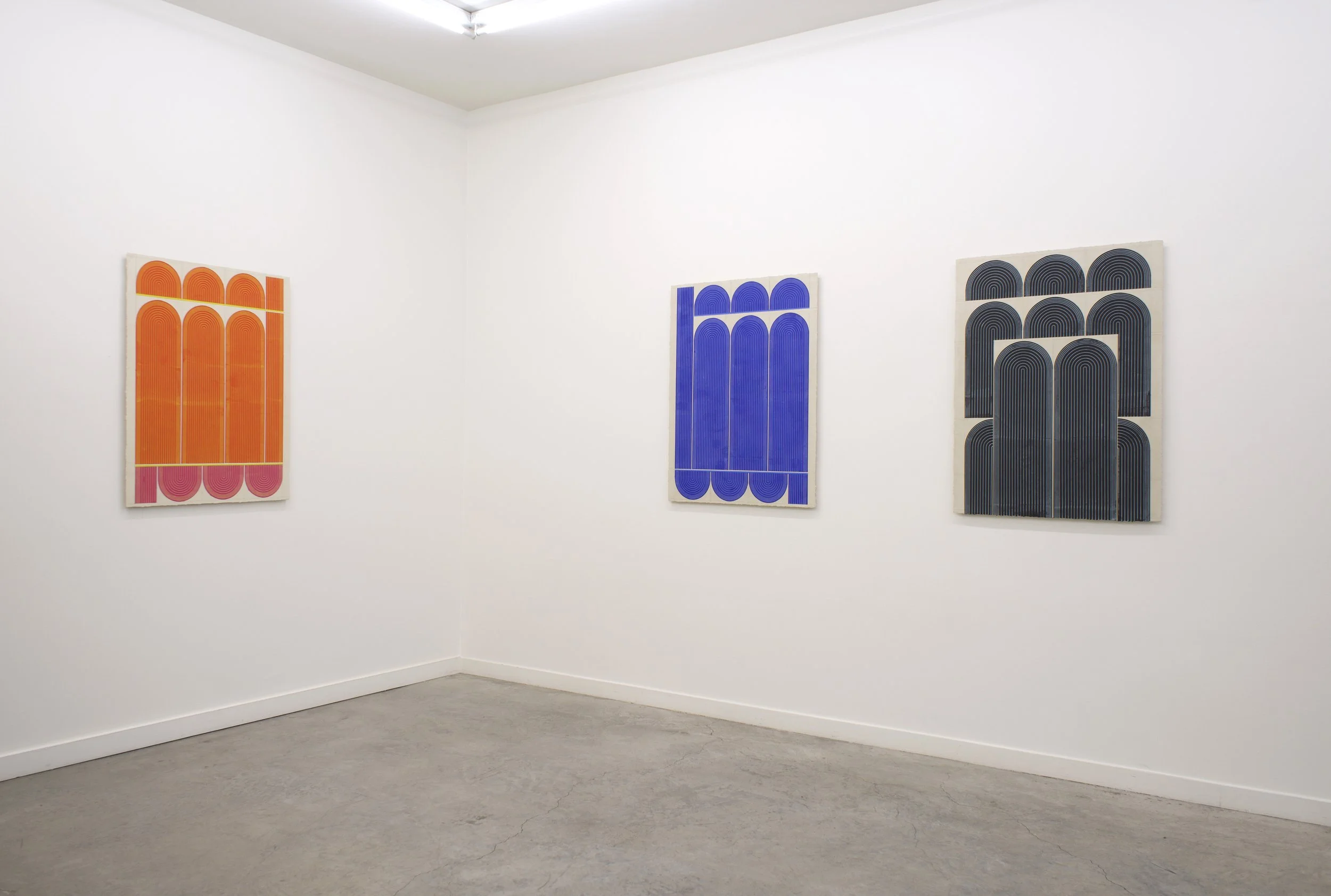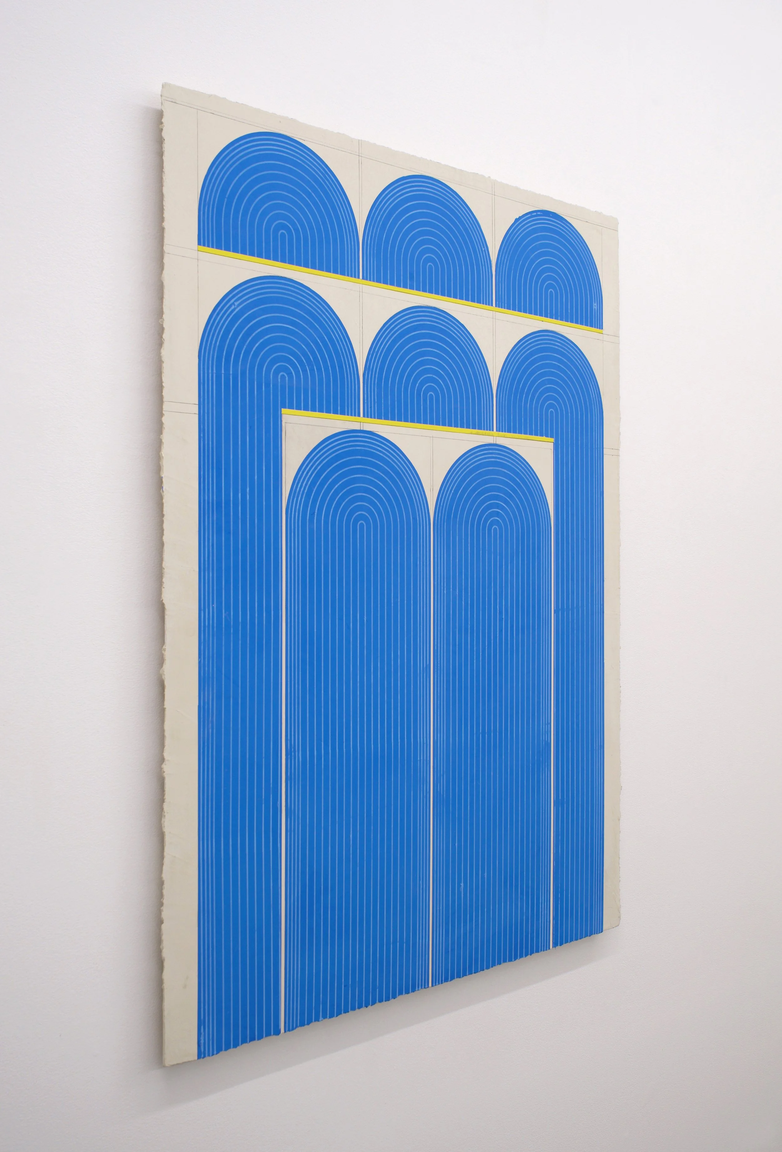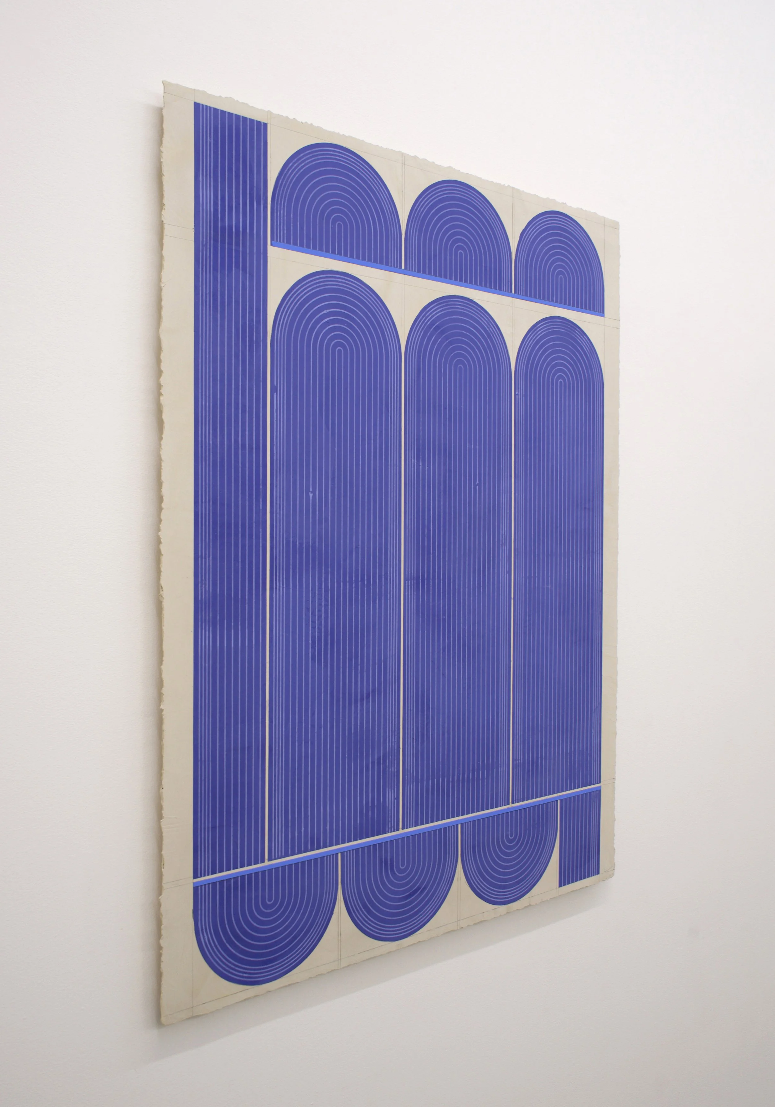 Ferguson’s exhibition Mod One, is inspired by the modernist ideas of functionality and characteristics of clean lines, bold geometric patterns and playful energy. The forms, always similar yet never identical, create a visual rhythm that transforms the entirety of the space into a vibrant, dynamic field. Imperfections, smudges and pencil markings imbue the work with texture, energy and a palpable sense of touch. What at first appears exacting quickly reveals a hand-hewn quality that animates the surfaces. Color is yet another unifying element. The artist thoughtfully juxtaposes the calming indigo blues of Mod One, and lowered saturation of the yellow and greens in Early Grove against the bolder, brighter works across the room.