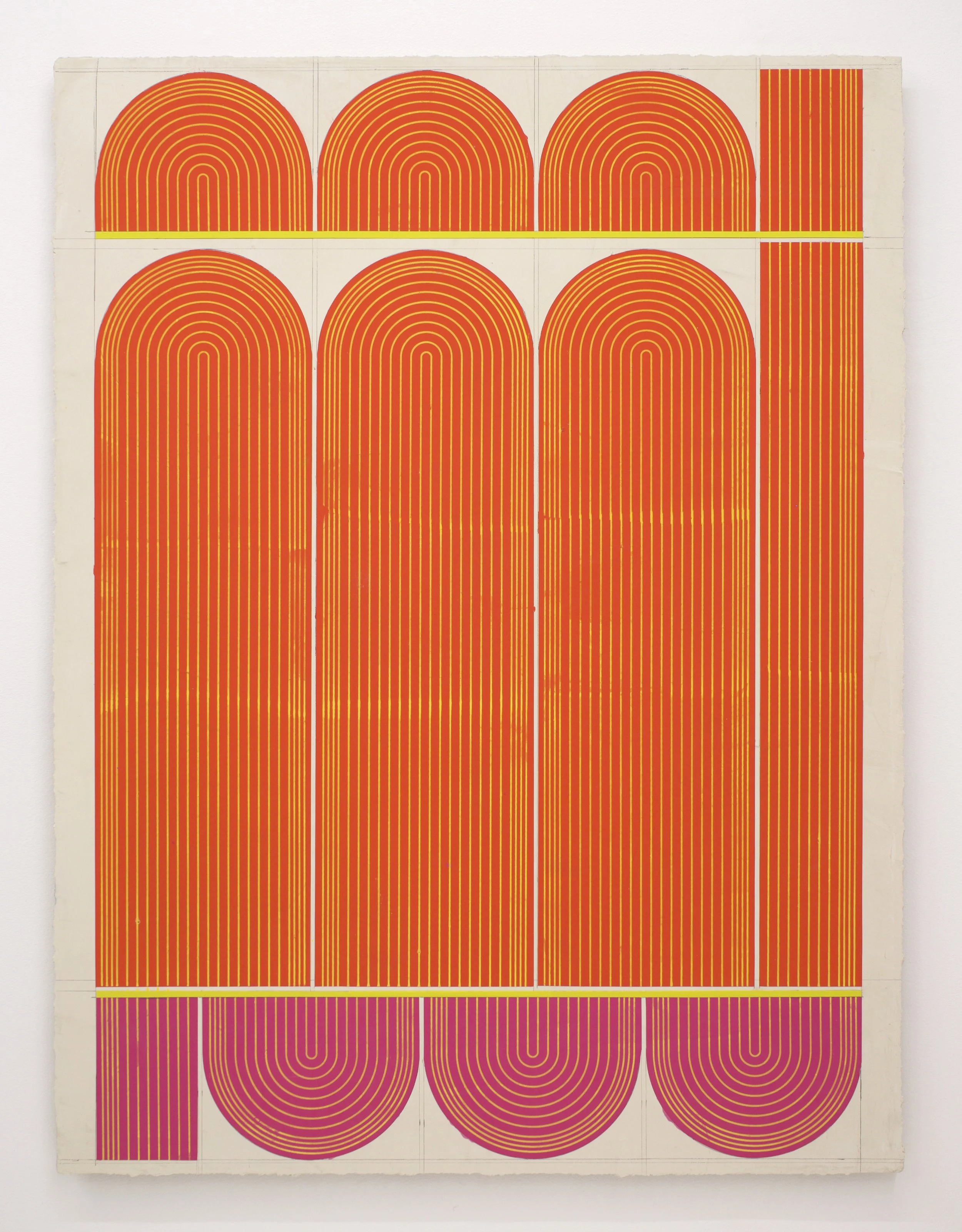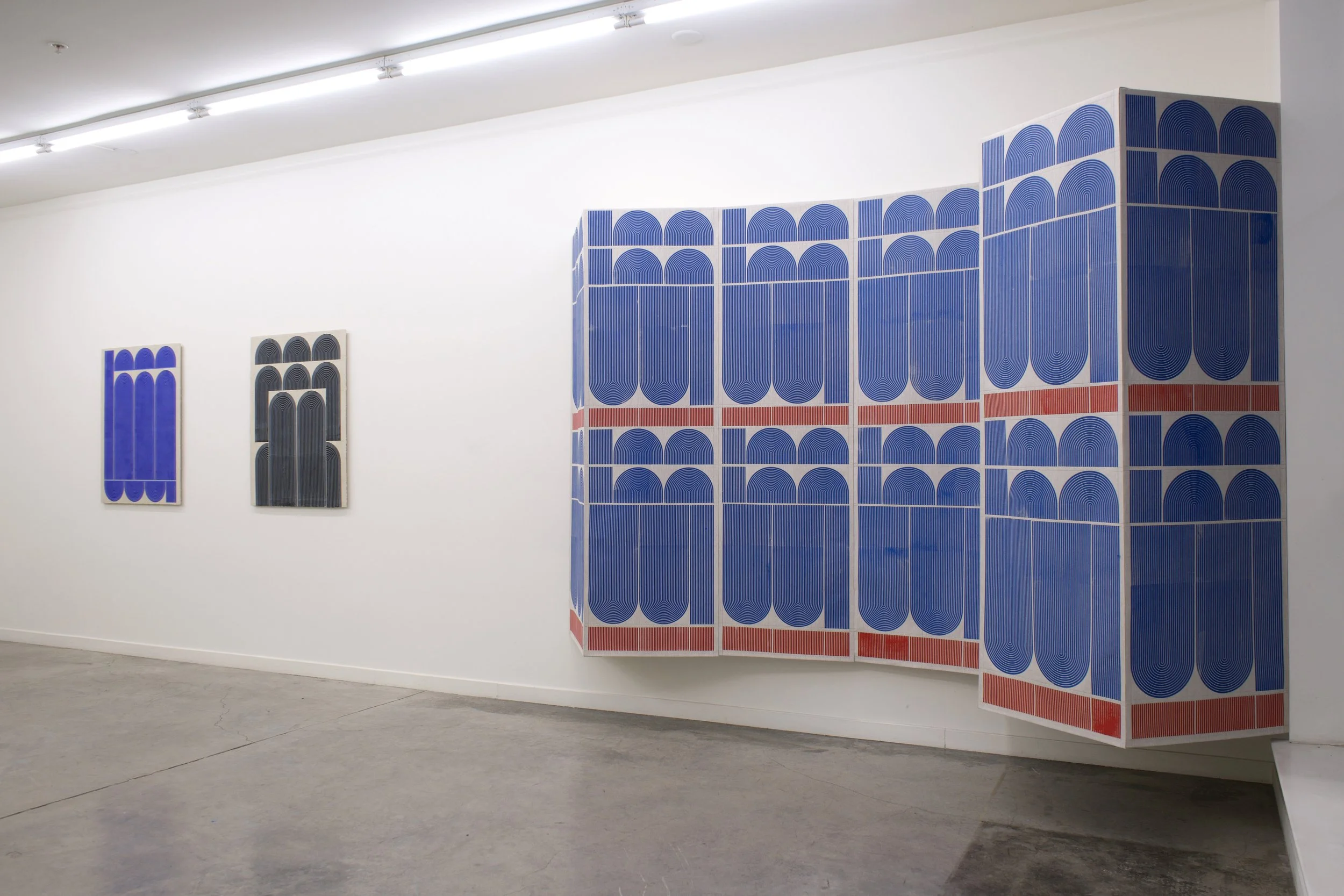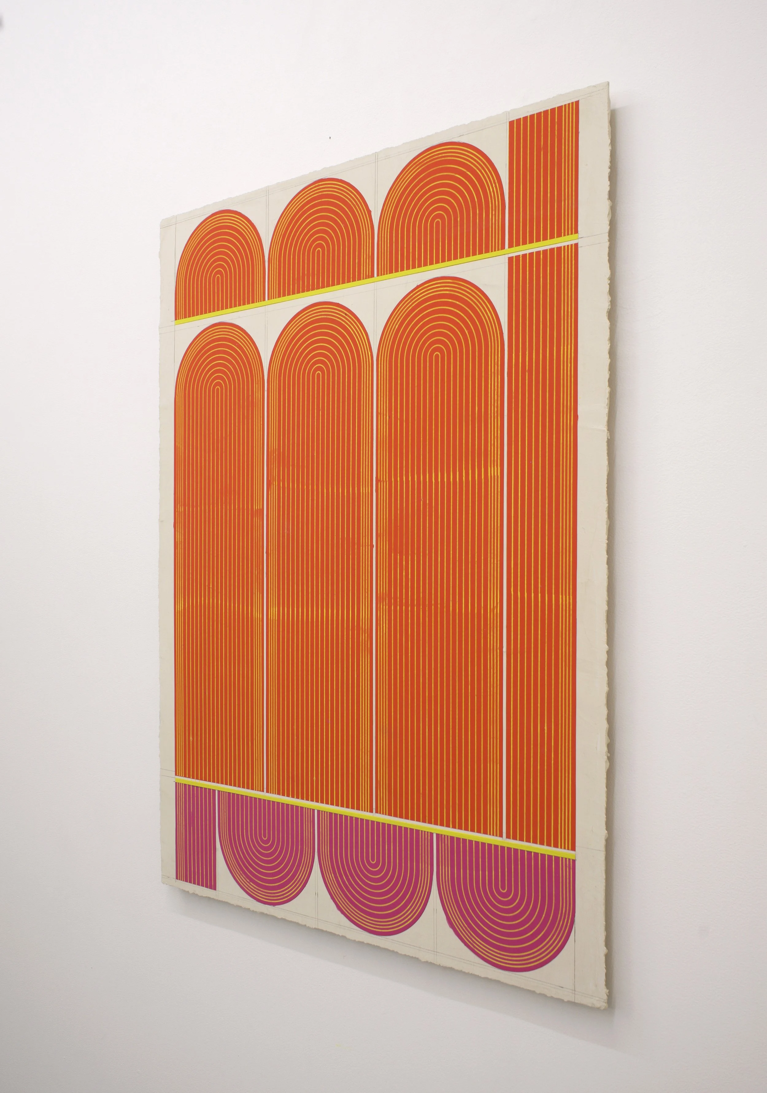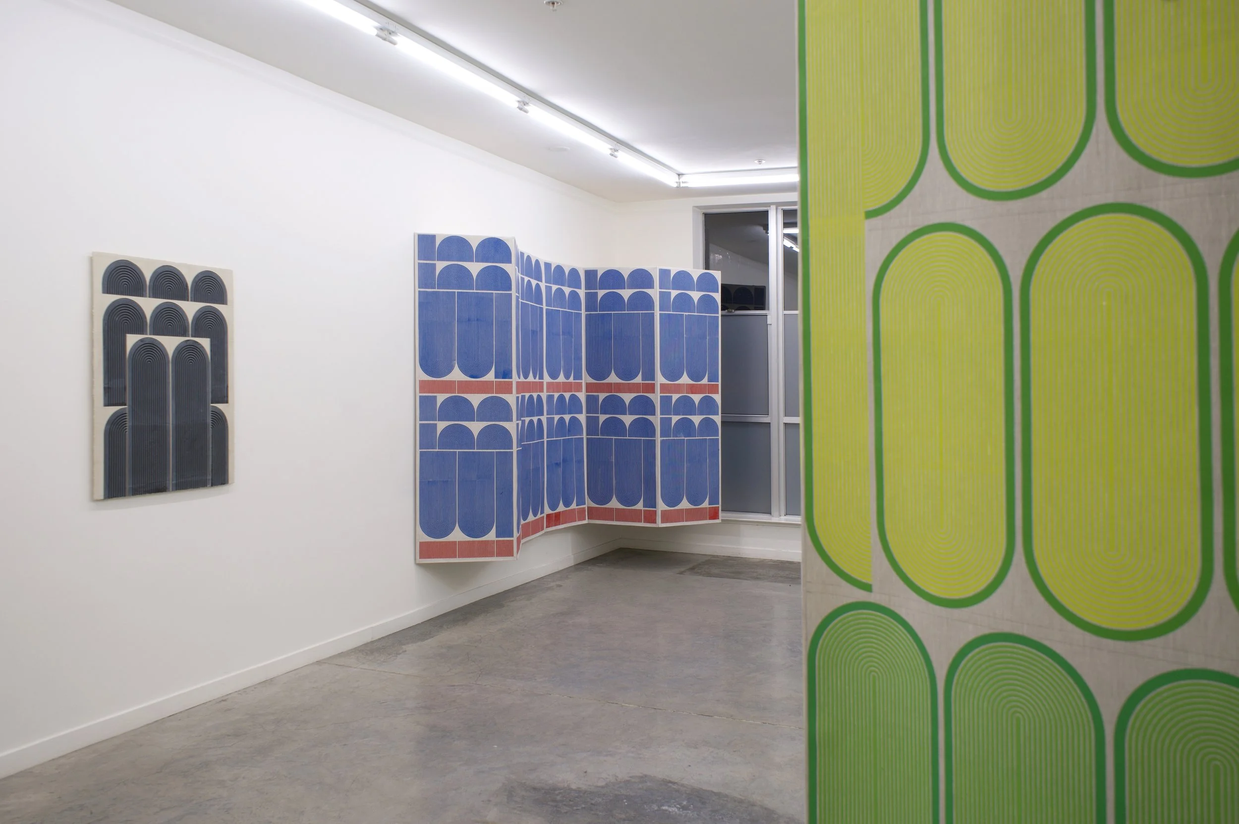 Ferguson’s exhibition Mod One, is inspired by the modernist ideas of functionality and characteristics of clean lines, bold geometric patterns and playful energy. The forms, always similar yet never identical, create a visual rhythm that transforms the entirety of the space into a vibrant, dynamic field. Imperfections, smudges and pencil markings imbue the work with texture, energy and a palpable sense of touch. What at first appears exacting quickly reveals a hand-hewn quality that animates the surfaces. Color is yet another unifying element. The artist thoughtfully juxtaposes the calming indigo blues of Mod One, and lowered saturation of the yellow and greens in Early Grove against the bolder, brighter works across the room.