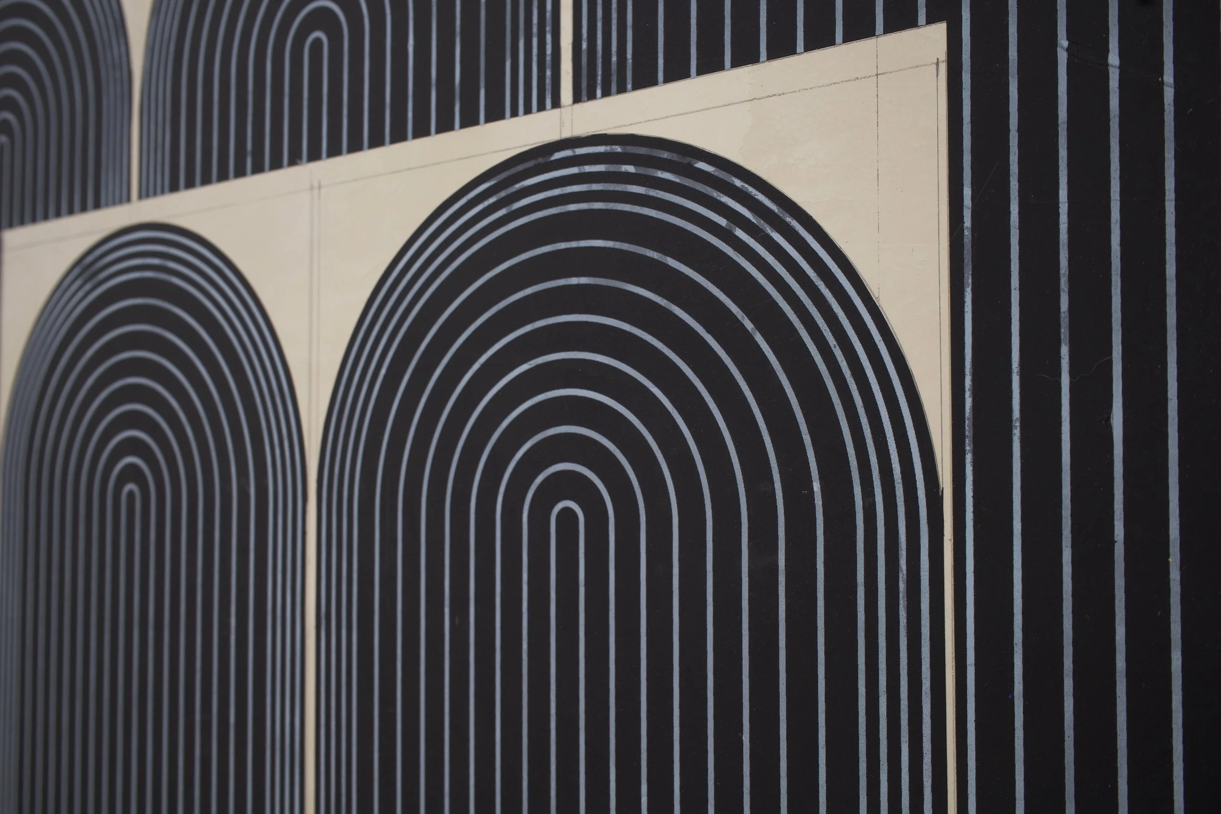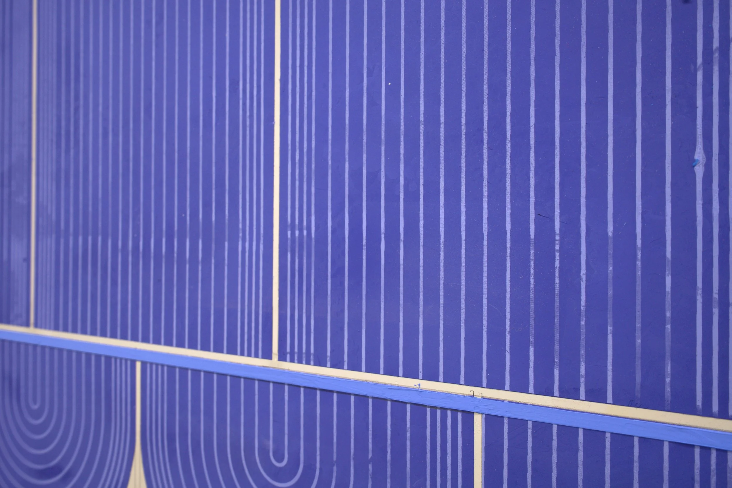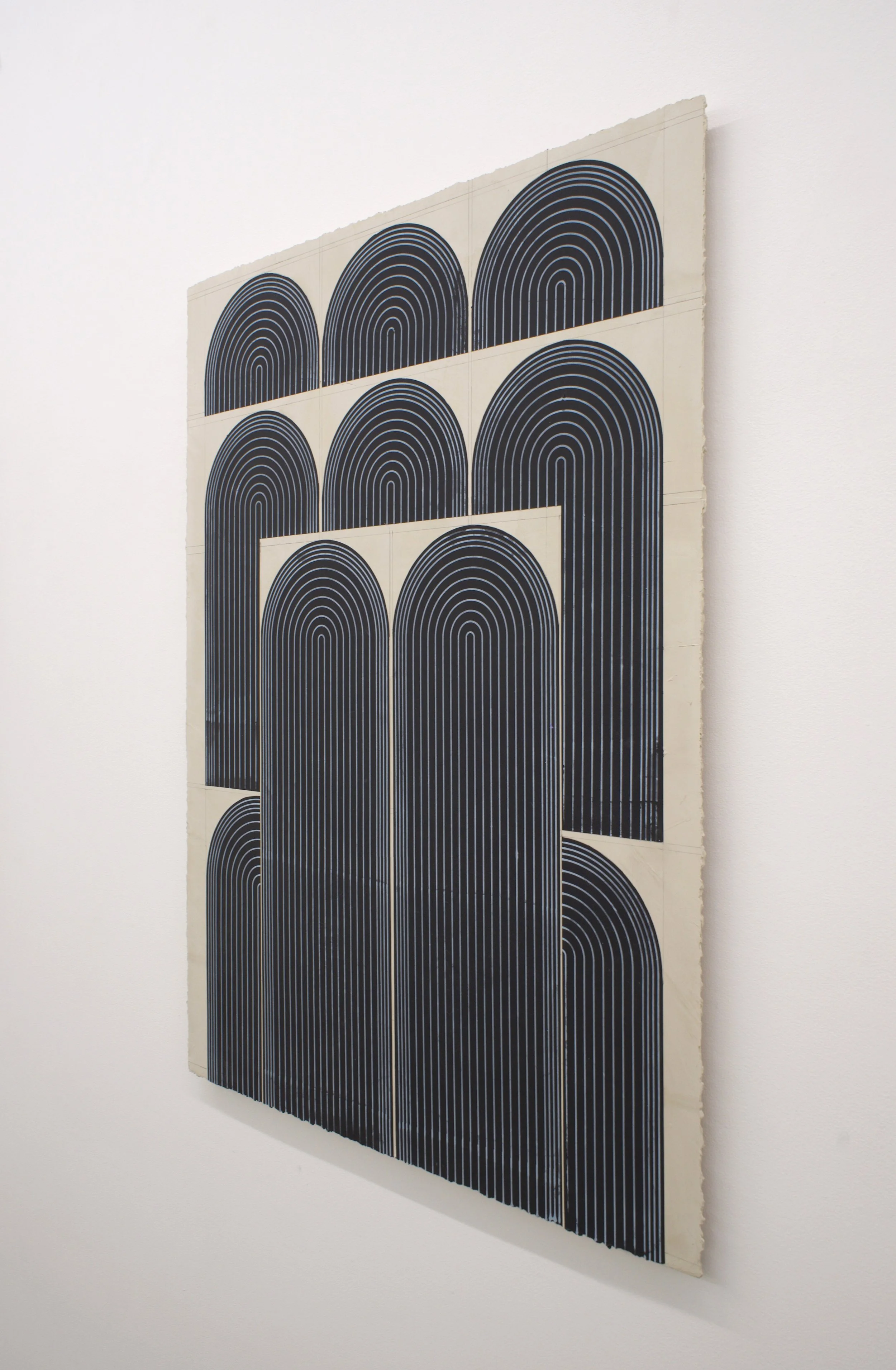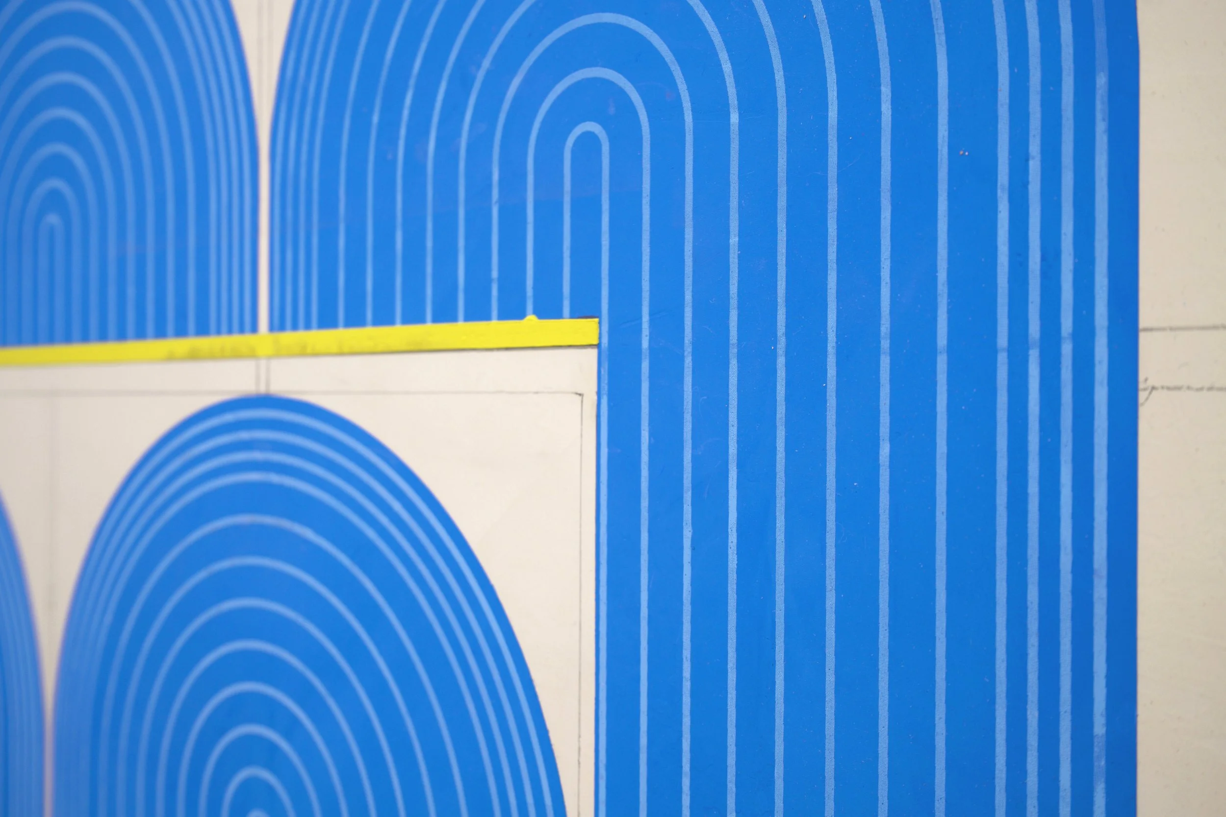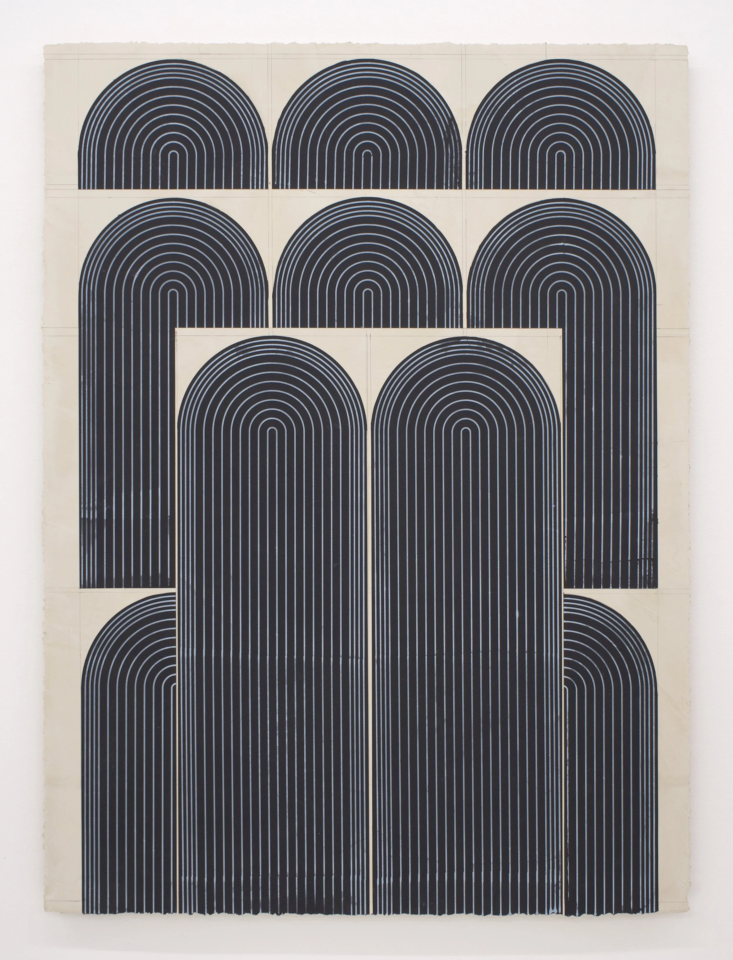Ferguson’s exhibition Mod One, is inspired by the modernist ideas of functionality and characteristics of clean lines, bold geometric patterns and playful energy. The forms, always similar yet never identical, create a visual rhythm that transforms the entirety of the space into a vibrant, dynamic field. Imperfections, smudges and pencil markings imbue the work with texture, energy and a palpable sense of touch. What at first appears exacting quickly reveals a hand-hewn quality that animates the surfaces. Color is yet another unifying element. The artist thoughtfully juxtaposes the calming indigo blues of Mod One, and lowered saturation of the yellow and greens in Early Grove against the bolder, brighter works across the room.