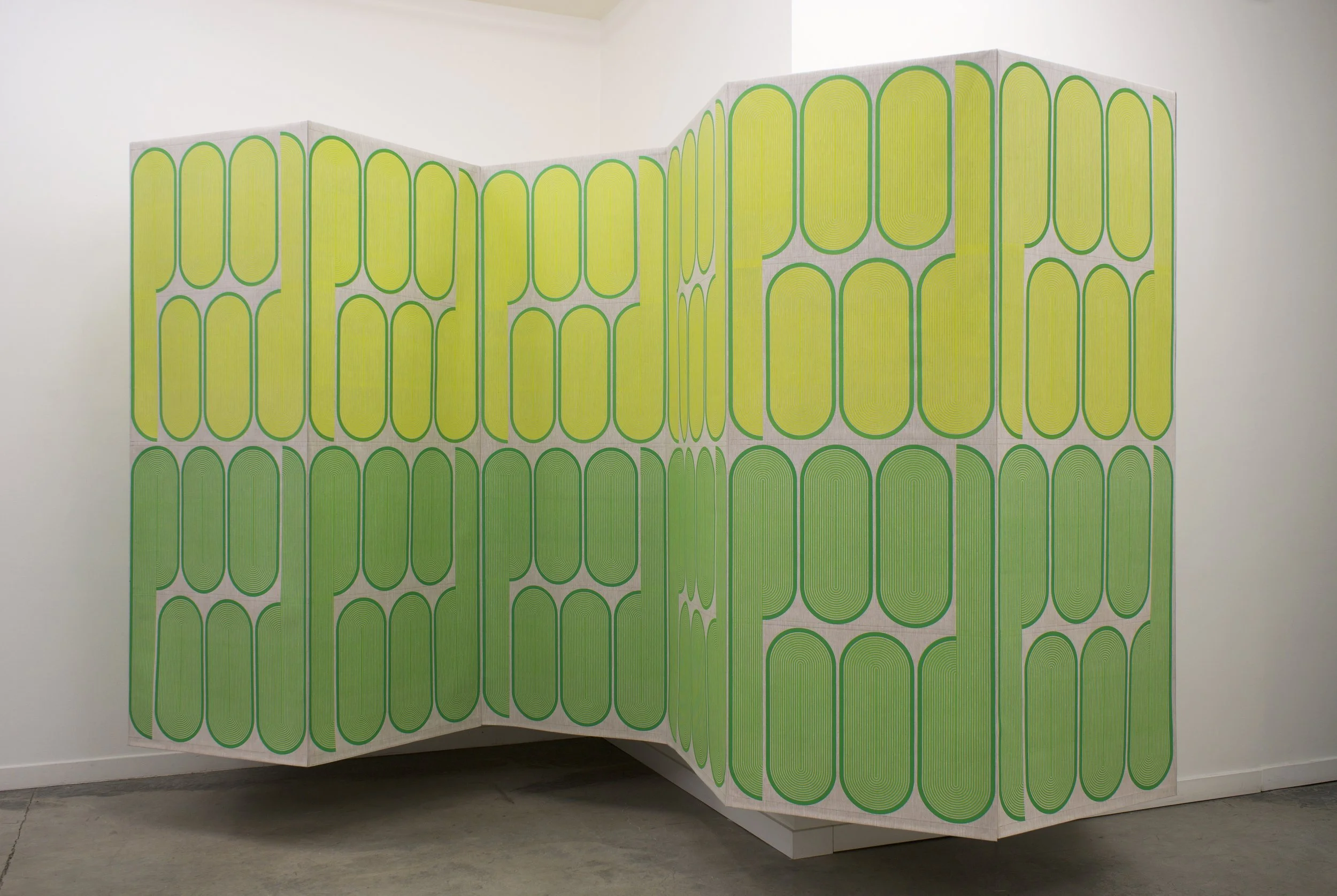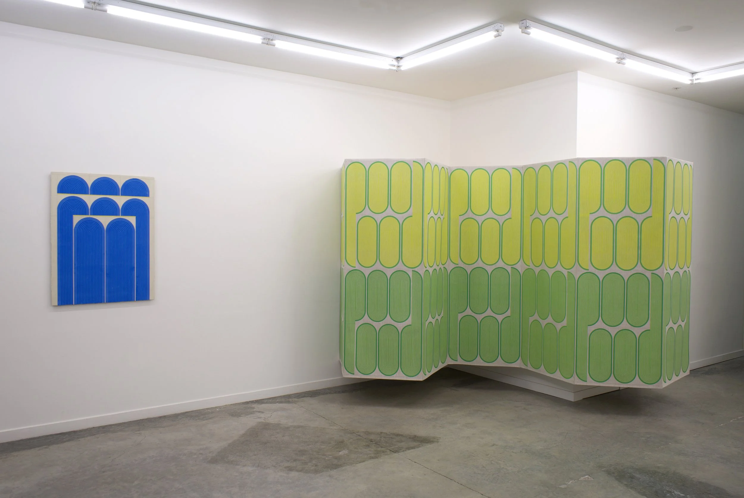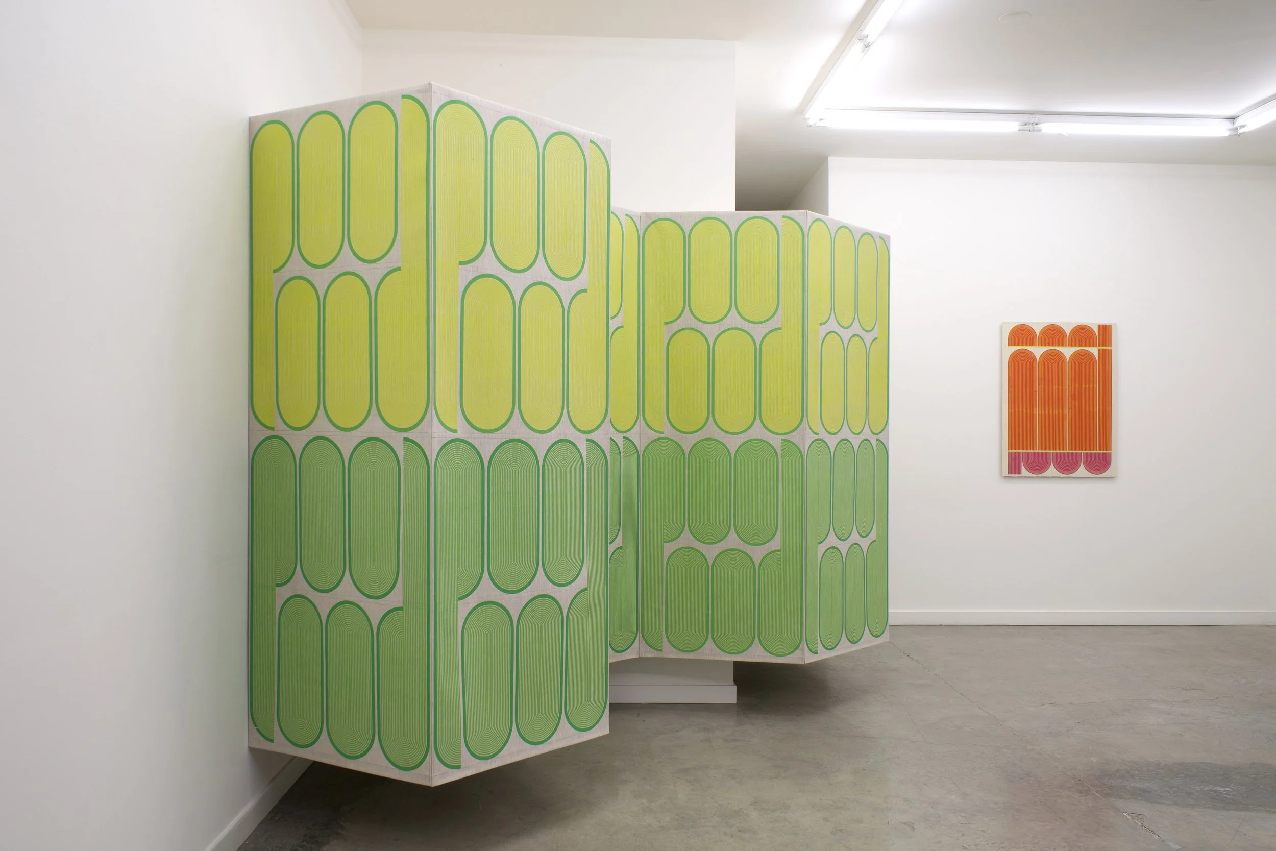 Hand printed in the artist’s studio, the linen works continue the artist’s exploration of hybrid painting/sculptures, and the ways in which flow and movement define spaces. The linear interventions of Mod One and Early Grove are anchored by the structure of the gallery, but are simultaneously open and loose. By inserting simple linen constructions and reframing the architectural environment, Ferguson explores something similar to what Fred Sandback (minimalist and conceptual sculptor) termed “pedestrian space,” and the idea of wanting to get off the pedestal, get off the canvas, and have the work right there along with everything else in the world. The term pedestrian also “involves the idea of utility—that a sculpture can be there to be engaged actively, while also having utopian glimmerings of art and life happily cohabiting.” One does not simply look at the work, but rather, one shares space with it.