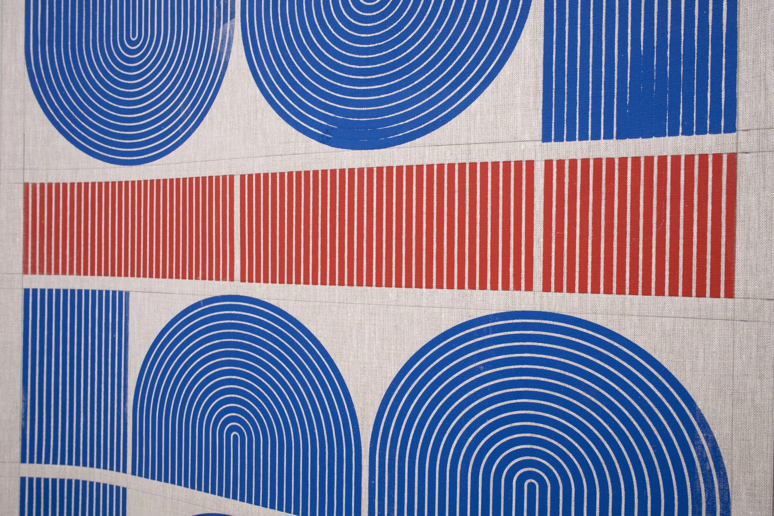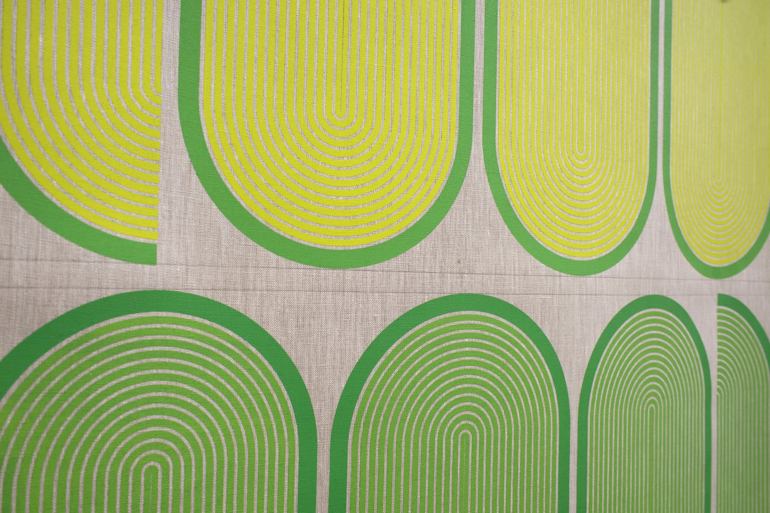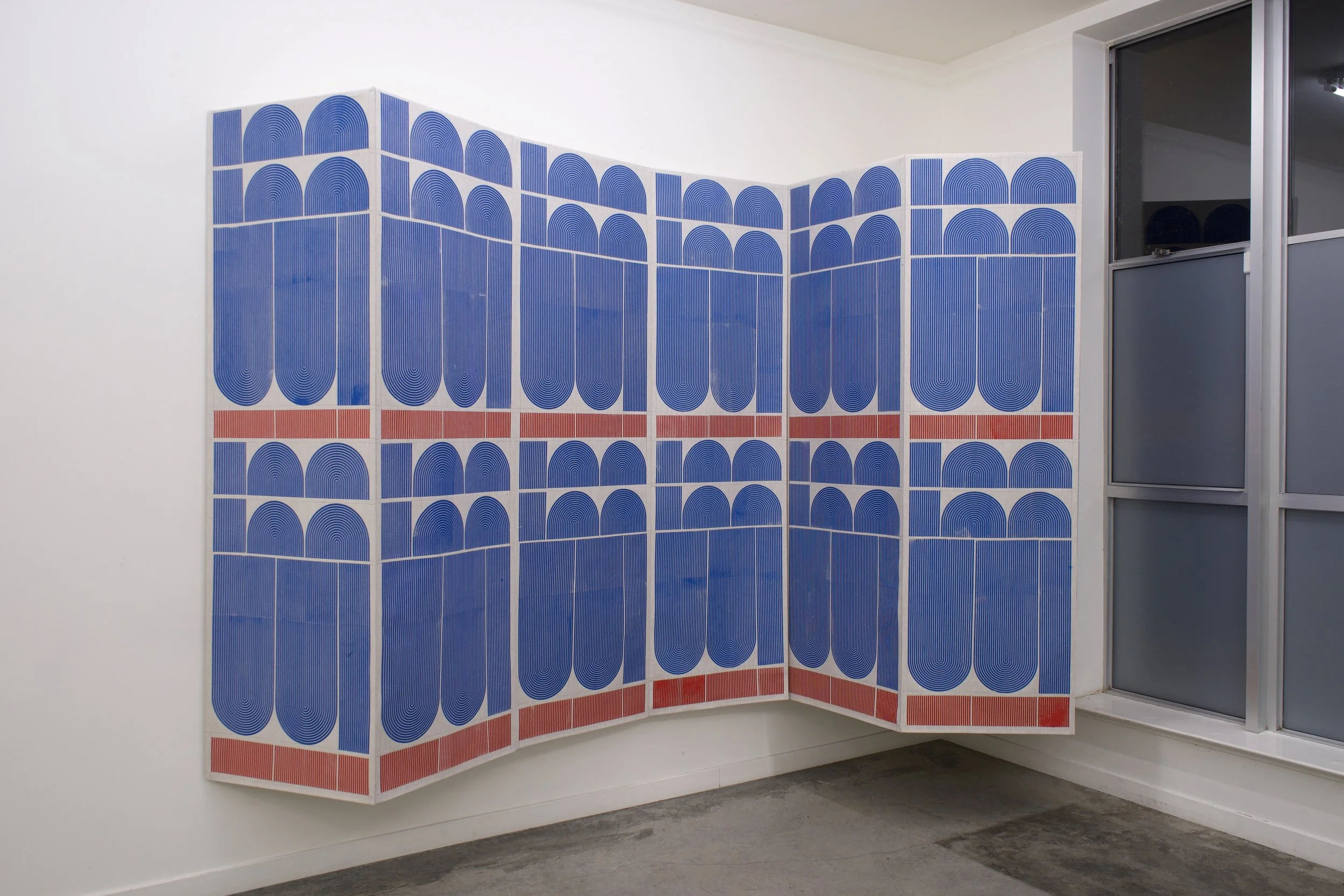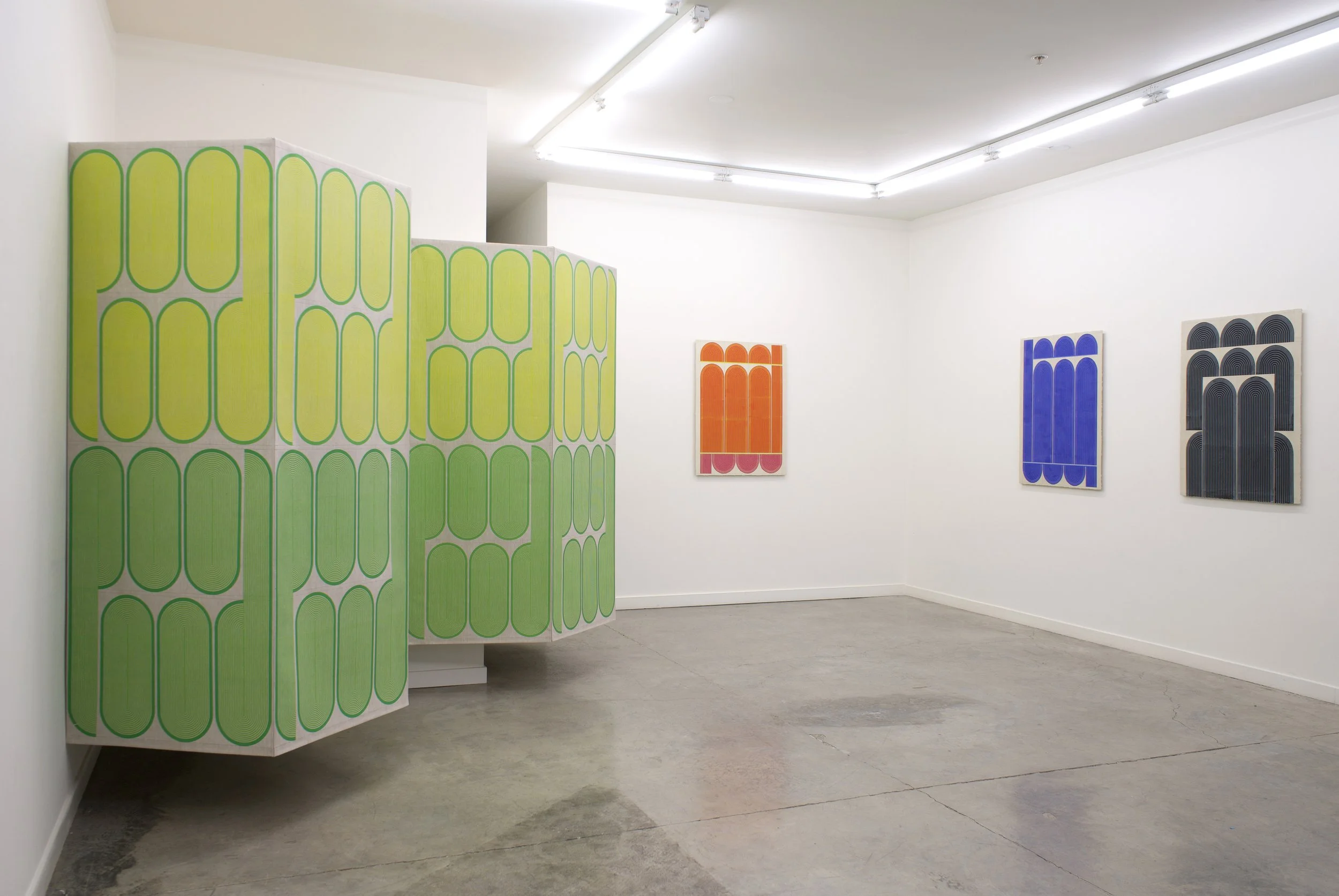 Hand printed in the artist’s studio, the linen works continue the artist’s exploration of hybrid painting/sculptures, and the ways in which flow and movement define spaces. The linear interventions of Mod One and Early Grove are anchored by the structure of the gallery, but are simultaneously open and loose. By inserting simple linen constructions and reframing the architectural environment, Ferguson explores something similar to what Fred Sandback (minimalist and conceptual sculptor) termed “pedestrian space,” and the idea of wanting to get off the pedestal, get off the canvas, and have the work right there along with everything else in the world. The term pedestrian also “involves the idea of utility—that a sculpture can be there to be engaged actively, while also having utopian glimmerings of art and life happily cohabiting.” One does not simply look at the work, but rather, one shares space with it.