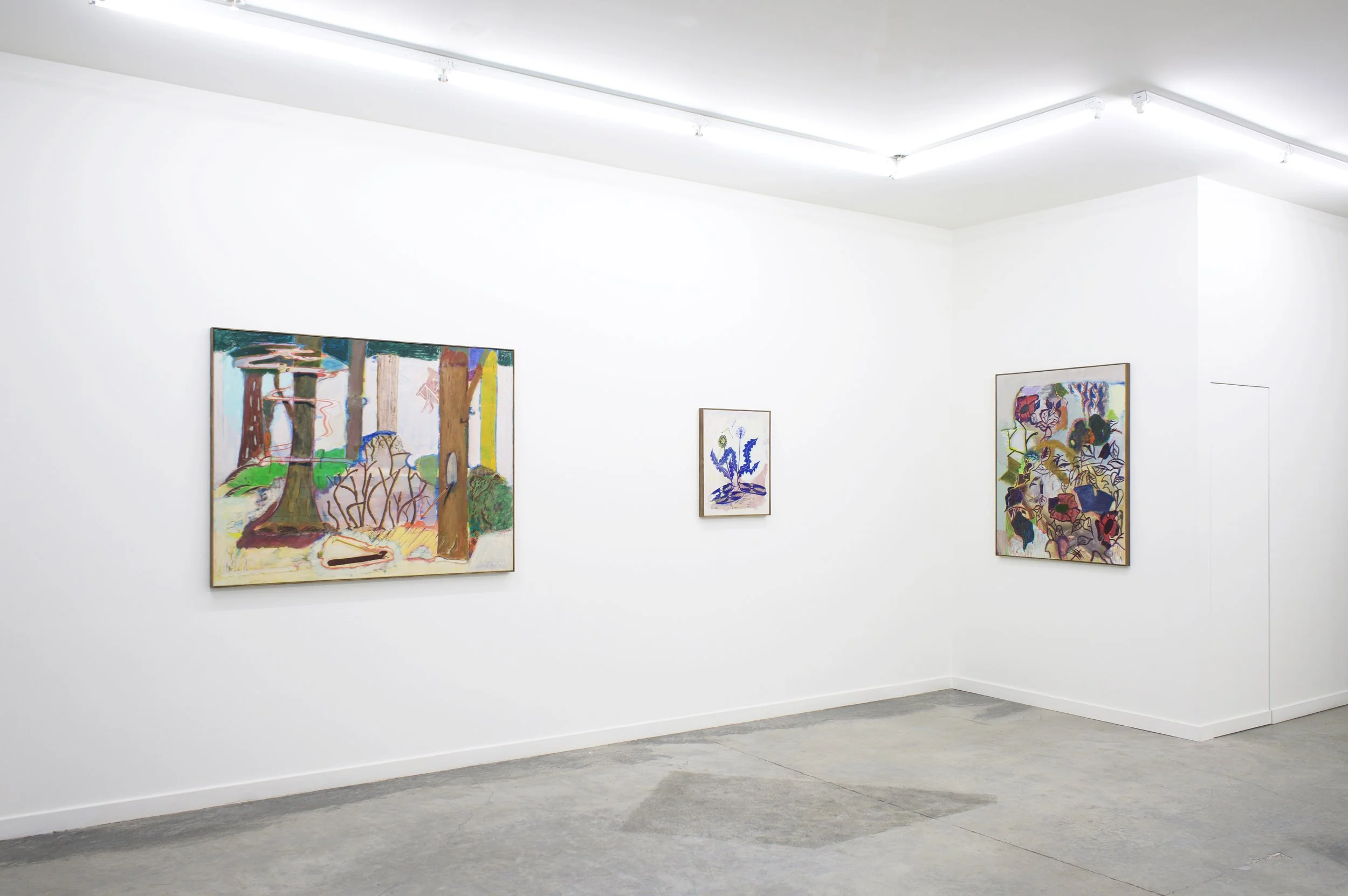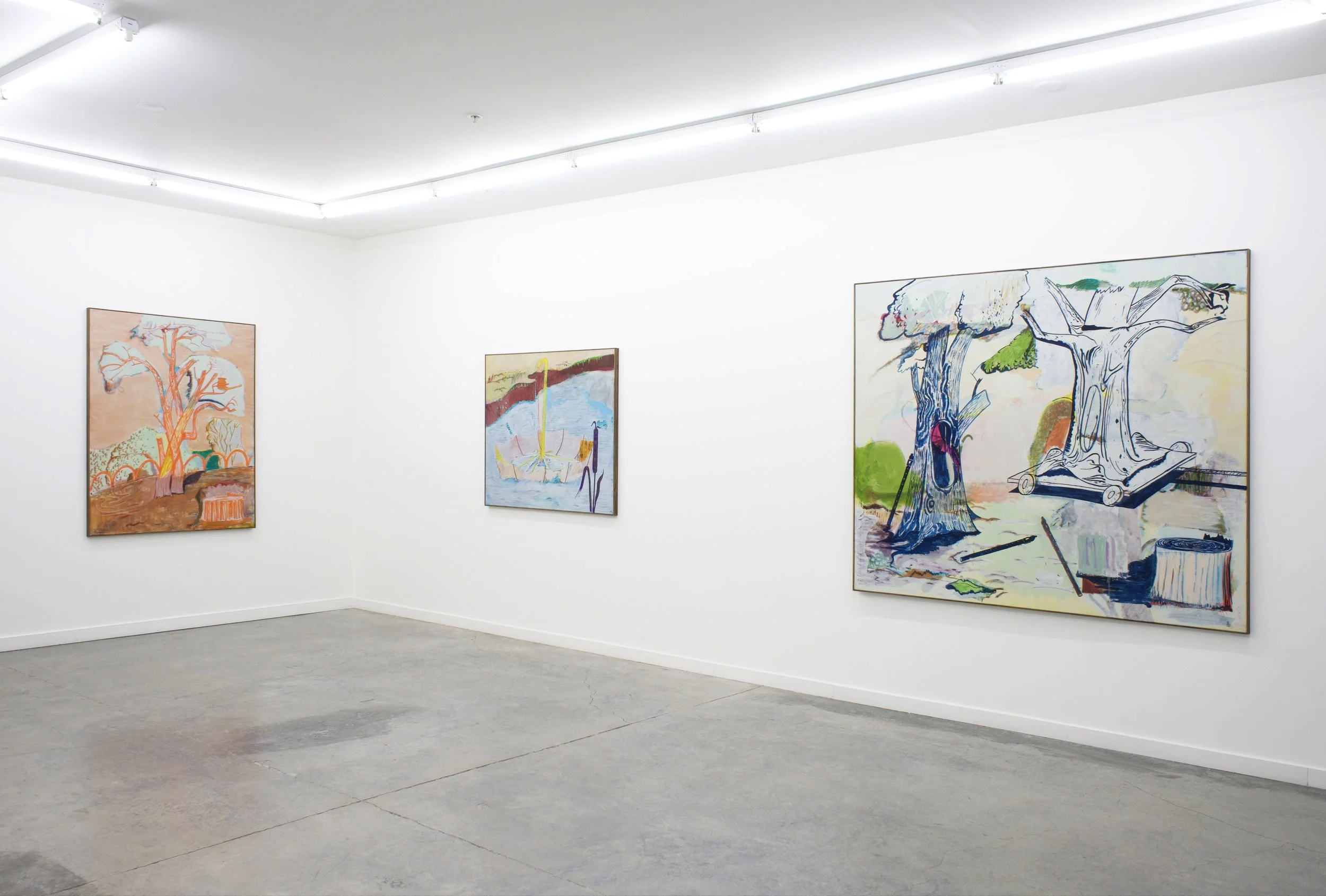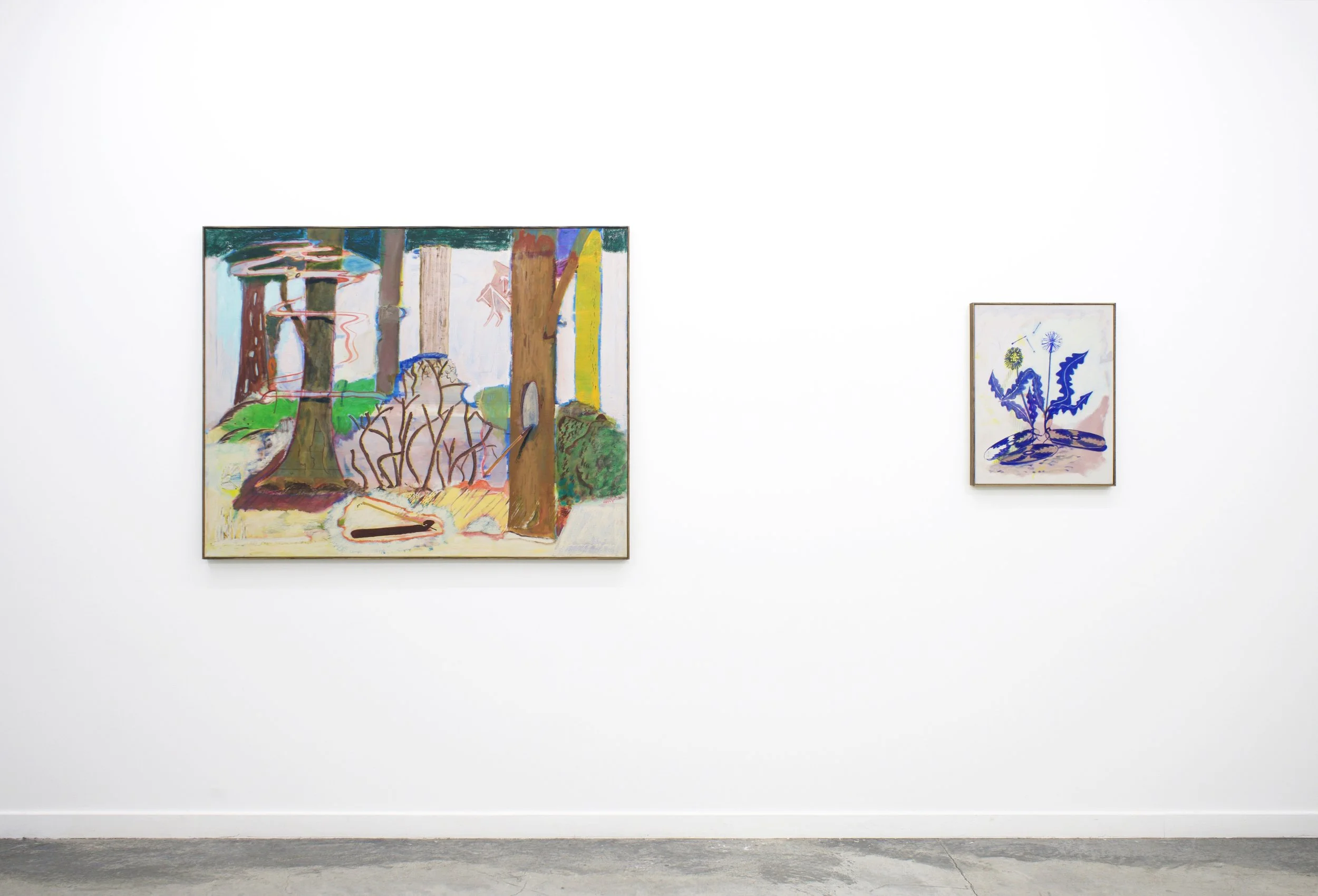 Transparent Trees presents a series of paintings that invite the viewer to wander through a strange and imaginary park, offering a poetic and whimsical peek into Christoph Roßner’s world. Inspired by comic books, Expressionism, the quirkiness of Surrealism, and a general love of the mundane, Roßner’s paintings “resemble dreams that are receding from consciousness.” By extracting moments from the everyday and combining them with chance and bizarreness, Roßner begins by setting the stage within which things can happen. Trees, grass, flowers and paths painted in faded and thinly painted colors, appear unsettlingly transparent and without weight - the way things might appear in a dream. Things seem like they have emerged out of a comic book, strangely alienated and yet curiously familiar. With the ease of his brushstroke, Roßner creates his theatrical environment, setting the stage to introduce his characters.