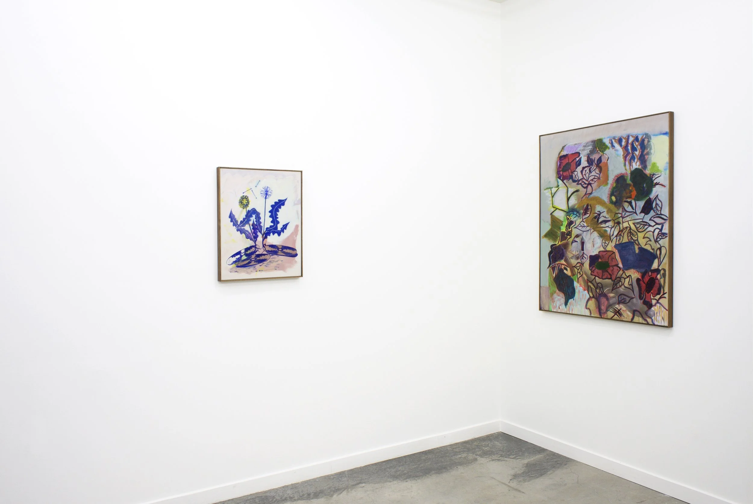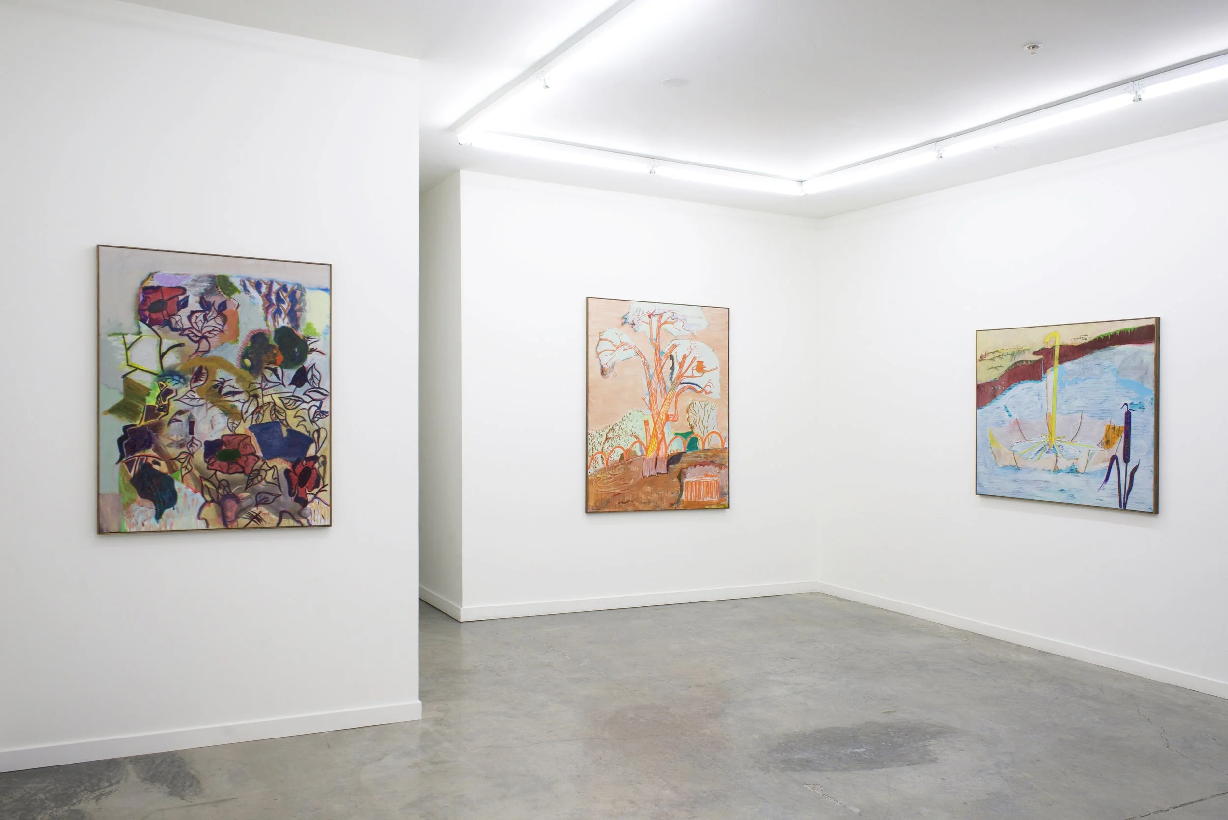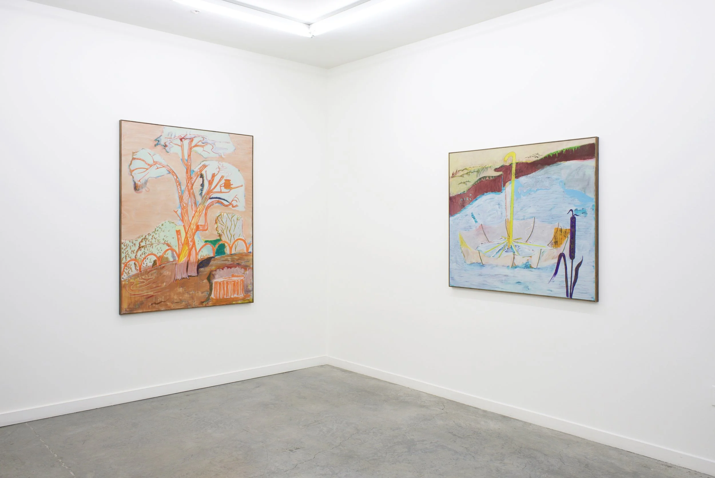 Transparent Trees presents a series of paintings that invite the viewer to wander through a strange and imaginary park, offering a poetic and whimsical peek into Christoph Roßner’s world. Inspired by comic books, Expressionism, the quirkiness of Surrealism, and a general love of the mundane, Roßner’s paintings “resemble dreams that are receding from consciousness.” By extracting moments from the everyday and combining them with chance and bizarreness, Roßner begins by setting the stage within which things can happen. Trees, grass, flowers and paths painted in faded and thinly painted colors, appear unsettlingly transparent and without weight - the way things might appear in a dream. Things seem like they have emerged out of a comic book, strangely alienated and yet curiously familiar. With the ease of his brushstroke, Roßner creates his theatrical environment, setting the stage to introduce his characters.