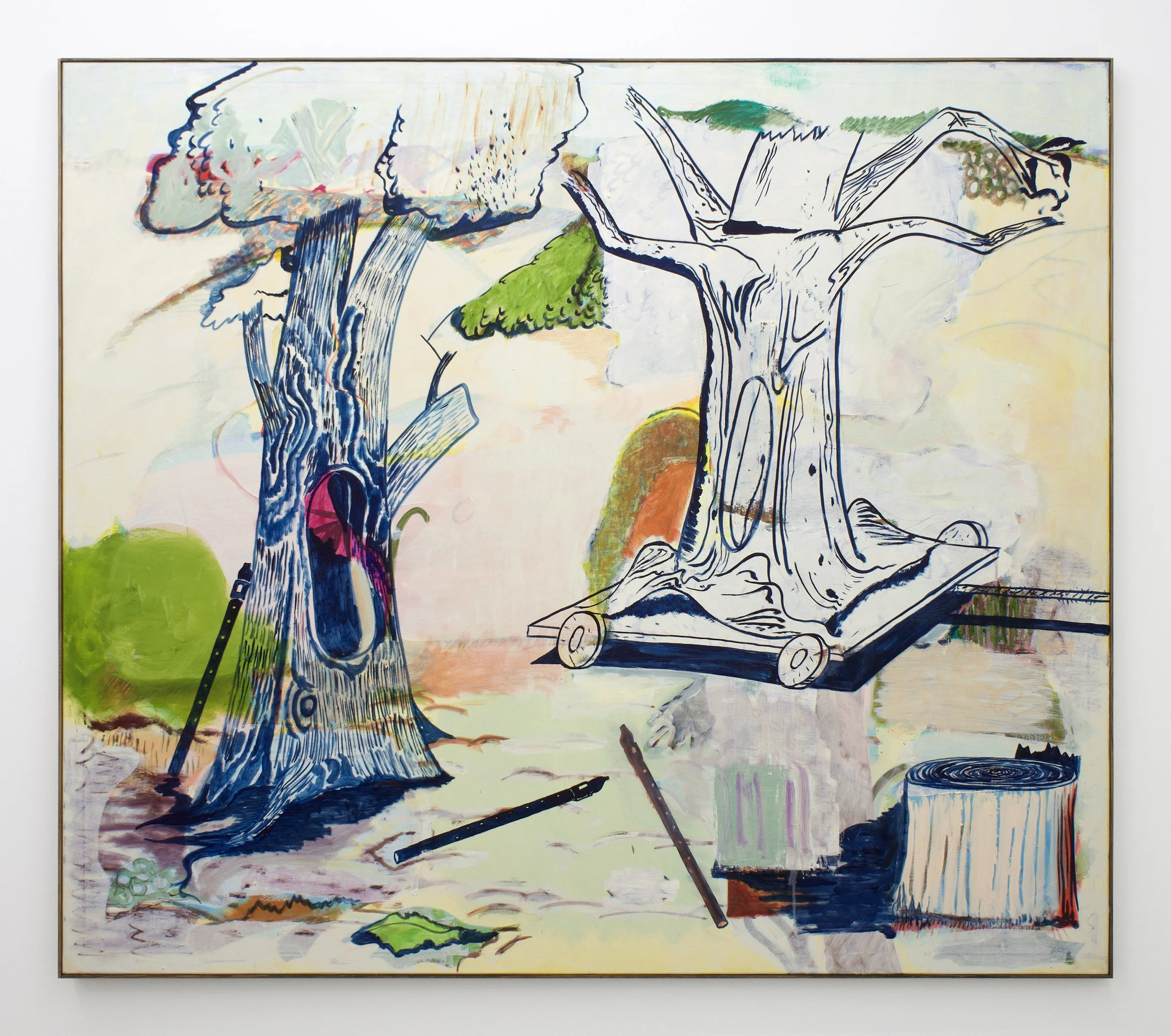 “We don't meet people directly in this park - the protagonists of the pictures are the trees, we don't find walkers nor animals in this park.” People, the characters, are absent in these new paintings. But numerous references appear in the form of various objects, things that seem to fit surprisingly, yet seamlessly into the natural landscape they inhabit. An umbrella floats upside down on a small pond. A blue dandelion grows out of a stack of old compact discs. In a small area of forest, incense sticks are lit and their smoke winds thoughtfully around a trunk. In the painting, Transparent Trees, flutes lie on the ground and lean against a trunk, much like tired walkers after a long journey. Subtle relationships and connections begin to form between the inhabitants of his paintings. Roßner uses our familiarity with these inanimate objects and environments as an opportunity to re-frame and re-introduce as strange, both physically and psychologically.